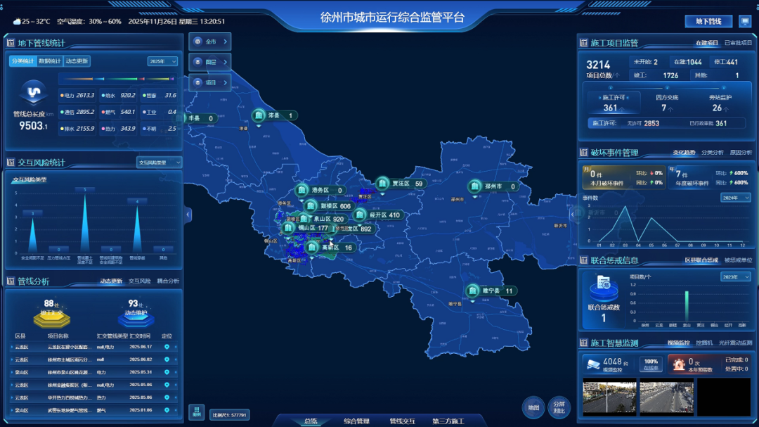 以场景应用为纽带,徐州推动业务融合从“被动配合”转向“主动联动”。第三方施工中,住建、城管与权属企业通过平台实现道路挖掘许可审批、管线查询、风险预警全流程衔接;应急处置时,公安、消防、医疗等部门与权属企业快速响应、无缝协作,形成了横向到边、纵向到底的全覆盖治理网络,让城市生命线在多方协同中保持安全畅通。