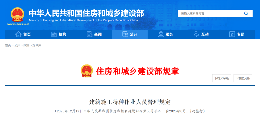 住建部公布《建筑施工特种作业人员管理规定》,自2026年6月1日起施行