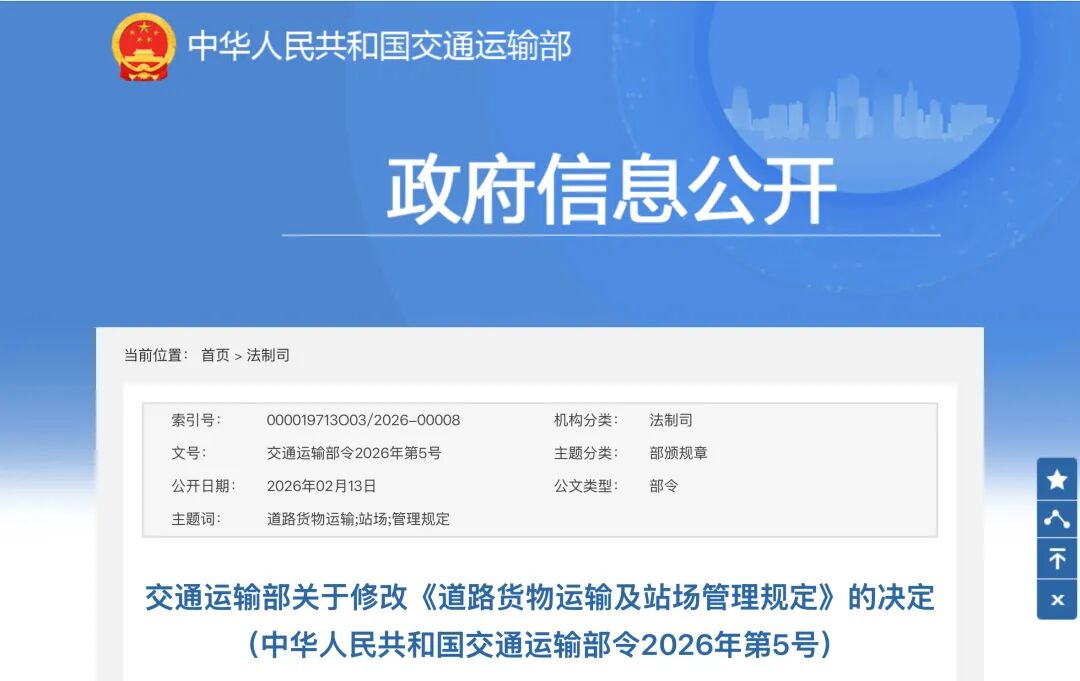 《交通运输部关于修改<道路货物运输及站场管理规定>的决定》已于2026年1月30日经第3次部务会议通过,现予公布,自2026年3月20日起施行。