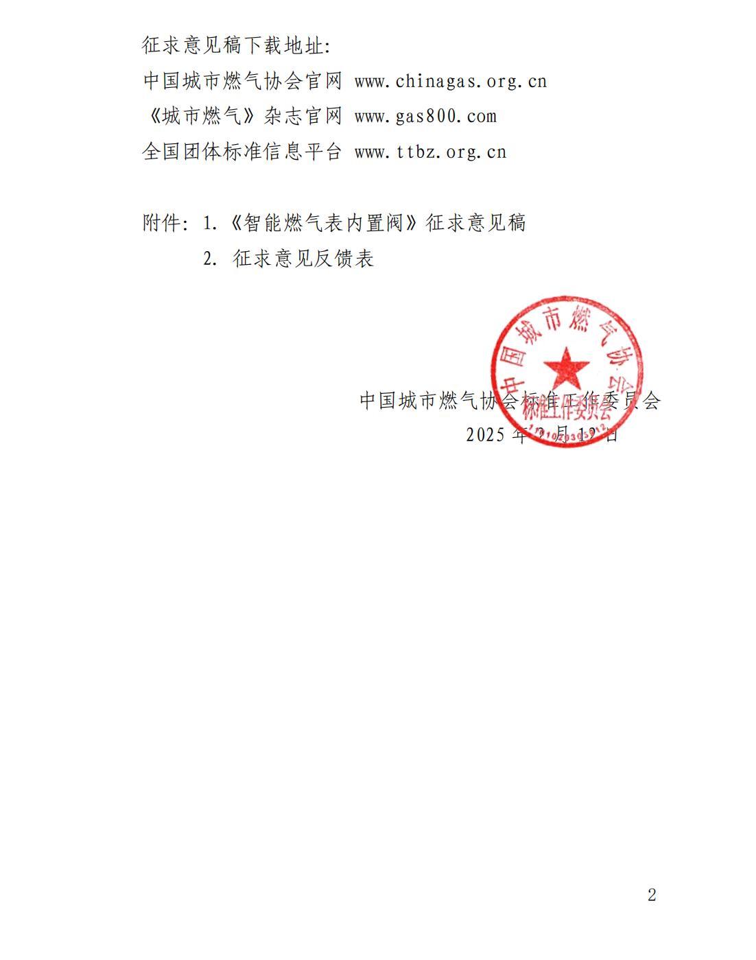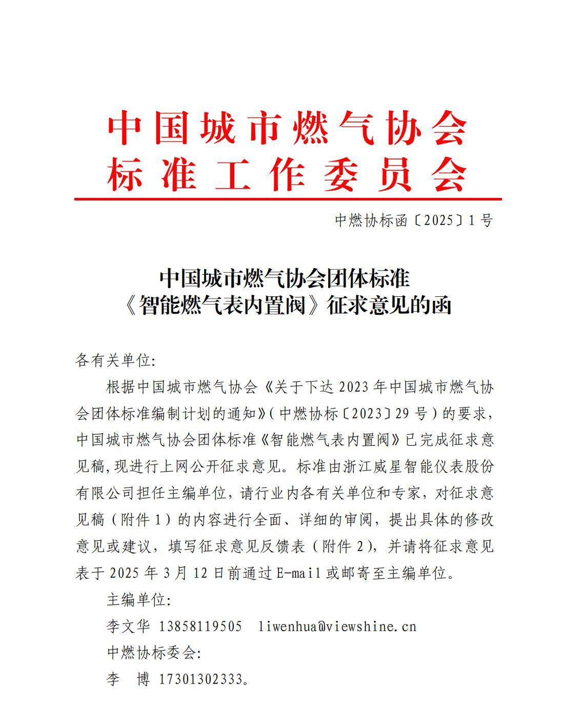 中燃协标函〔2025〕1号中国城市燃气协会标准工作委员会关于对团体标准《智能燃气表内置阀》征求意见的函