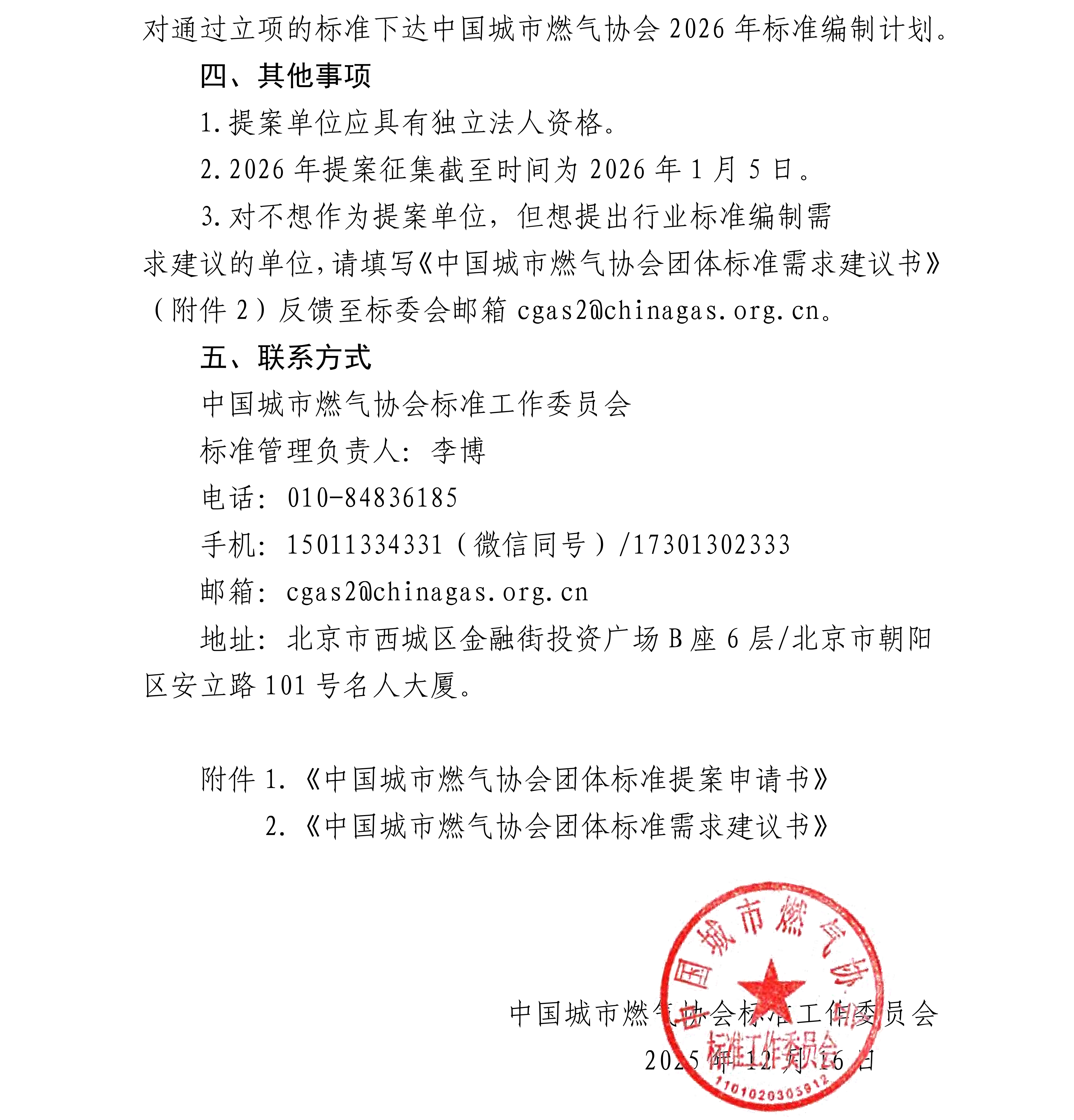 关于征集2026年中国城市燃气协会团体标准提案的通知